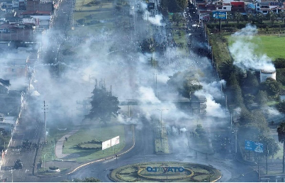 El gobierno nacional de Daniel Noboa, asesorado por el sionismo y Trumpismo, tanto desde la gestión pública como por empresas privadas de “seguridad” ensaya un escenario similar a Gaza e hiperfocaliza “al otro” “al indígena como terrorista” en la provincia de Imbabura y ataca con más de 5 000 militares fuertemente armados, con drones, helicópteros, vehículos de guerra a la población civil conformada por personas de la Nacionalidad Kichwa (Cotacachi, Otavalo). Pichincha (Cayambe, Quito: barrios del pueblo Kitu Kara), Loja (Saraguro). También a población afroecuatoriana en la provincia de Imbabura, en Carchi a población mestiza. Además, bombardeo a una montaña asesinando a animales silvestres. En la siguiente fotografía se observa la represión de policías y militares a la población de Otavalo.